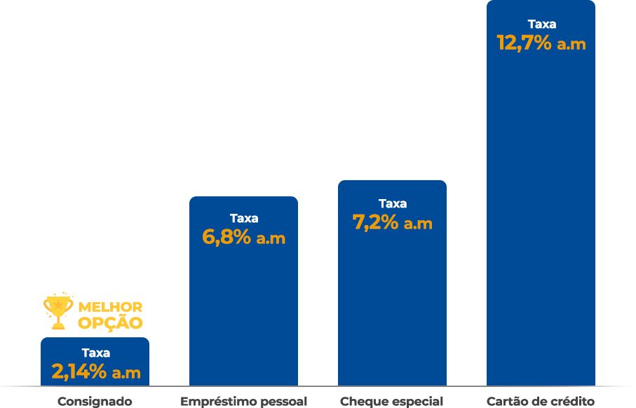 O crédito consignado é rápido e descomplicado, ou seja, a aprovação sai muito mais rápido. Além disso tem parcelas pré-fixadas, maiores prazos e juros mais baixos em comparação aos demais créditos do mercado, compare e veja.